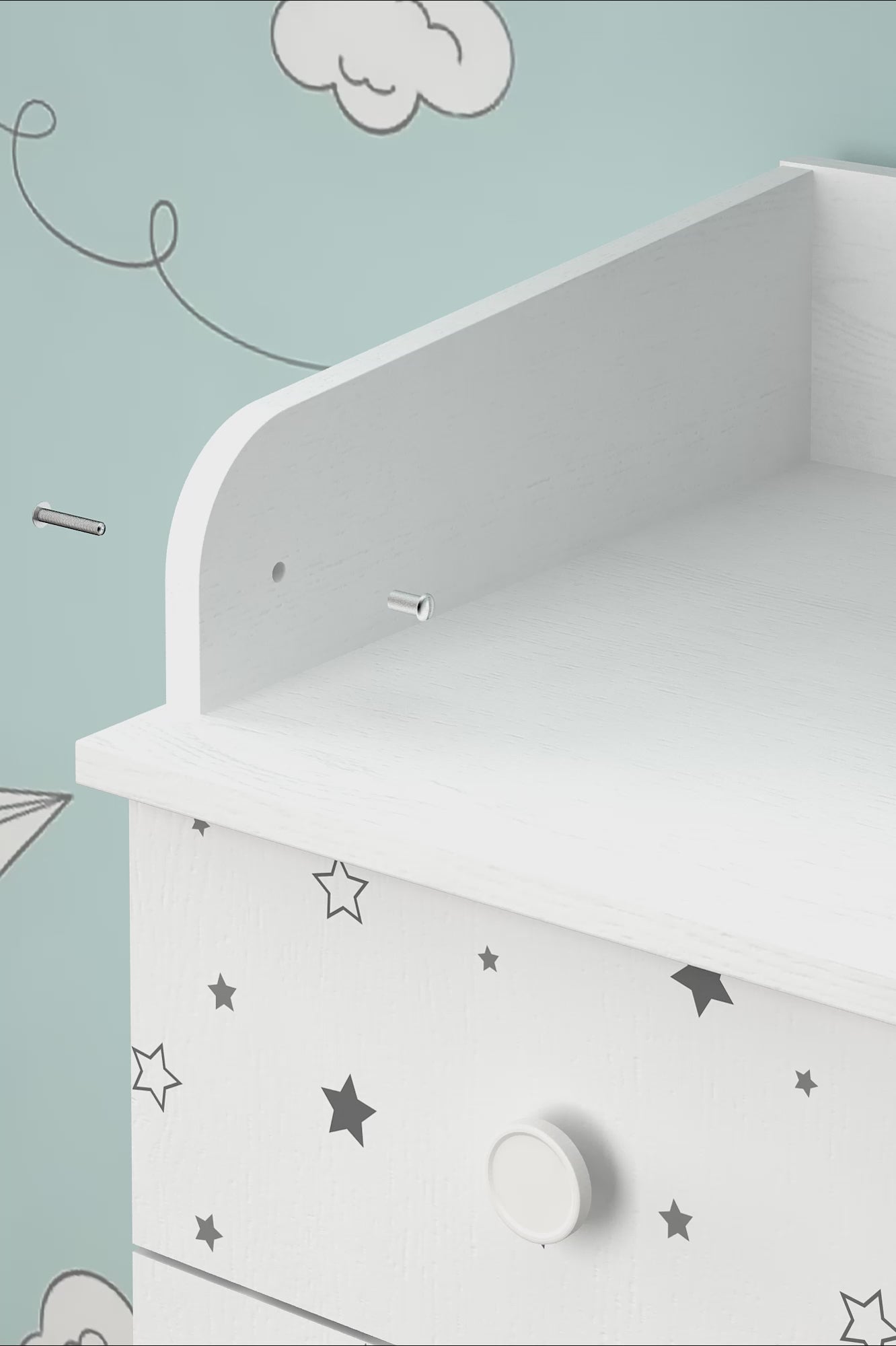 The classic white design of the Changing Dresser 800 Teddy harmoniously fits into any nursery decor. The high-quality surface treatment ensures a sophisticated appearance, making the dresser a standout piece in your baby's room.